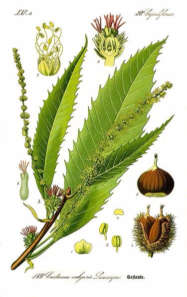 Le Châtaignier ou Châtaignier commun est une espèce d'arbres à feuilles caduques de la famille des fagacées. Il produit des fruits : les châtaignes.